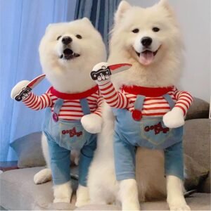 No te olvides de tu mejor amigo en la celebración. Este disfraz de Chucky para perros es una forma divertida y encantadora de incluir a tu mascota en la festividad. Hecho de materiales cómodos y ajustables, este disfraz asegura que tu peludo se sienta bien mientras se convierte en el «perro diabólico» de la noche. Con detalles que replican al famoso muñeco asesino, tu perro no solo se verá adorable, sino que también será el centro de atención en cualquier reunión. ¡Prepárate para recibir halagos y risas!
